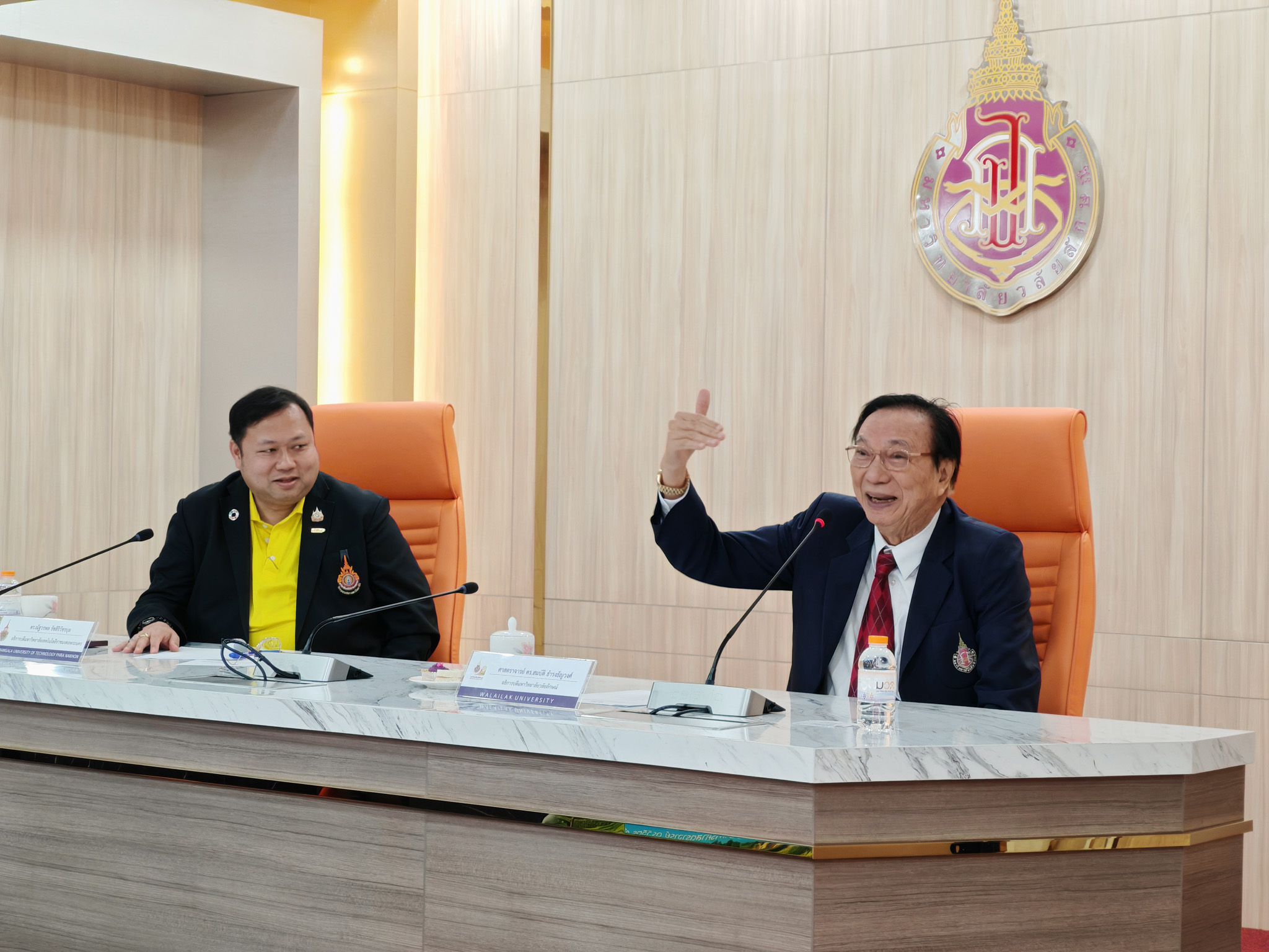 วันนี้ (1 สิงหาคม 2568) ศาสตราจารย์ ดร.สมบัติ ธำรงธัญวงศ์ อธิการบดีมหาวิทยาลัยวลัยลักษณ์ พร้อมด้วย รองศาสตราจารย์ ดร.ศิวฤทธิ์ พงศกรรังศิลป์ รองอธิการบดี ผู้ช่วยศาสตราจารย์ ดร.ฟารีดา  เจะเอาะ ผู้ช่วยอธิการบดี และคณะผู้บริหาร-บุคลากรจากอุทยานวิทยาศาสตร์และเทคโนโลยี สถาบันส่งเสริมการวิจัยและนวัตกรรมสู่ความเป็นเลิศ และส่วนสื่อสารองค์กร ให้การต้อนรับคณะผู้บริหารและบุคลากร จากมหาวิทยาลัยเทคโนโลยีราชมงคลพระนคร (มทร.พระนคร) จำนวน 11 คน นำโดย ดร.ณัฐวรพล รัชสิริวัชรบุล อธิการบดี ในโอกาสเดินทางมาศึกษาดูงานด้านวิชาการ การสร้างเครือข่ายความร่วมมือที่เกี่ยวข้องกับทรัพย์สินทางปัญญาและการวิจัย โดยให้การต้อนรับ ณ ห้องโมคลาน ชั้น 3 อาคารศาสตราจารย์ ดร.วิจิตร ศรีสอ้าน
