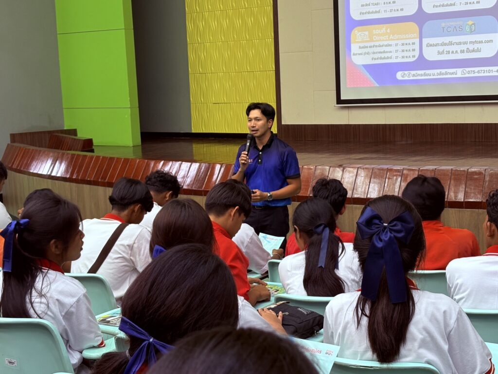 วันนี้ 12 กันยายน 2568 ส่วนสื่อสารองค์กรร่วมกับศูนย์บริการการศึกษาให้การต้อนรับครูและนักเรียนชั้นมัธยมศึกษาปีที่ 4 – 6 โรงเรียนท่าฉางวิทยาคาร จังหวัดสุราษฎร์ธานี จำนวนกว่า 80 คน โดยให้การต้อนรับ ณ ห้อง 3310 อาคารเรียนรวม 3 มหาวิทยาลัยวลัยลักษณ์ น้อง ๆ ได้รับฟังข้อมูลแนวทางการศึกษาต่อเตรียมความพร้อมสู่มหาวิทยาลัย เพื่อเลือกหลักสูตรที่ใช่และแนวทางการประกอบอาชีพที่เหมาะสม