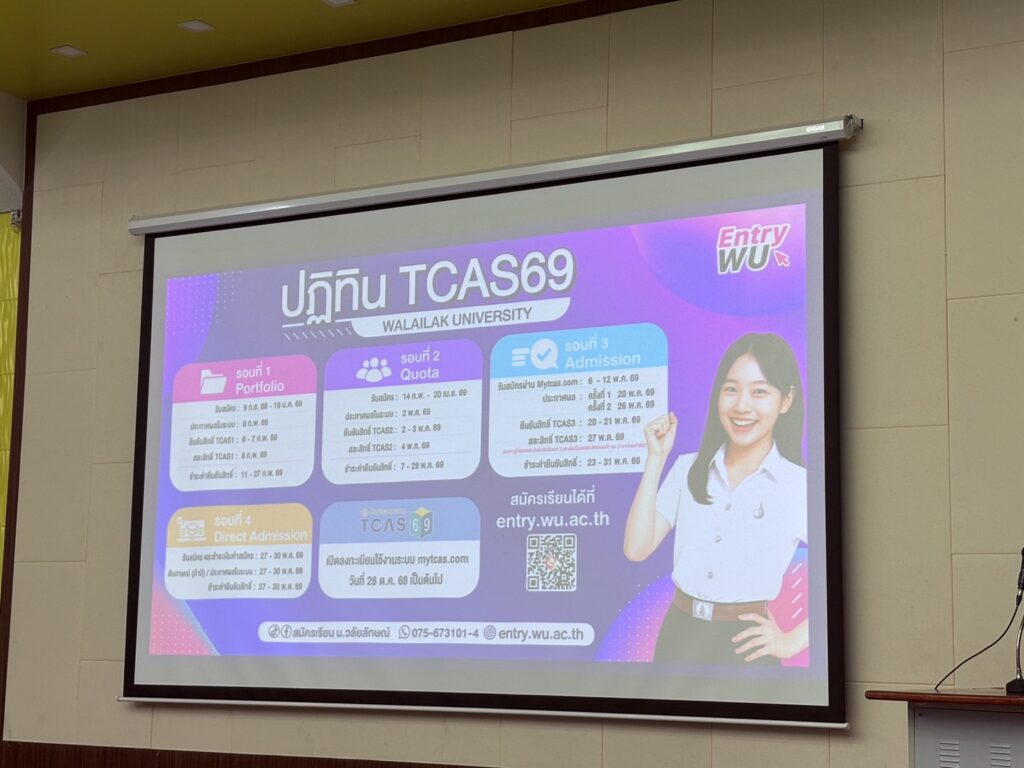 ทั้งนี้ มหาวิทยาลัยวลัยลักษณ์กำลังเปิดรับสมัครนักศึกษา TCAS69 รอบ Portfoloio ตั้งแต่วันนี้ – 19 มกราคม 2569 สมัครได้ที่ https://entry.wu.ac.th/ หรือสอบถามรายละเอียดเพิ่มเติม 075 673 101 -105
