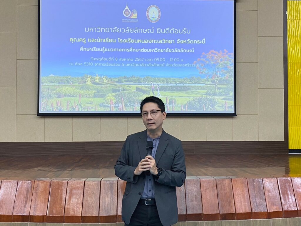 วันนี้ (08/08/67) เวลา 09.00-12.00 น. รองศาสตราจารย์ ดร.วิรุจ ถิ่นคร คณบดีสำนักวิชาสถาปัตยกรรมศาสตร์และการออกแบบ ให้การต้อนรับครูและนักเรียนชั้นมัธยมศึกษาชั้นปีที่ 5-6 จากโรงเรียนหนองทะเลวิทยา จังหวัดกระบี่ จำนวน 160 คน นำโดยนายนัฐภล เพ็ชรทอง รองผู้อำนวยการโรงเรียน ในโอกาสมาศึกษาเรียนรูู้และเยี่ยมชมมหาวิทยาลัย โดยรับฟังข้อมูลแนวทางเตรียมความพร้อมในการศึกษาต่อมหาวิทยาลัยวลัยลักษณ์ (TCAS68) จากสำนักวิชาที่น้องๆ สนใจ ประกอบด้วย สำนักวิชาสถาปัตยกรรมศาสตร์และการออกแบบ สำนักวิชาการจัดการ สำนักวิชานิติศาสตร์ และสำนักวิชาครุศาสตร์และศิลปศาสตร์ ทั้งนี้ น้องๆ นักเรียนได้รับความรู้และเทคนิคดีๆ ในการเตรียมความพร้อม เพื่อยื่นสมัครTCAS68 รอบ Portfolio ซึ่งมหาวิทยาลัยวลัยลักษณ์ จะเปิดรับนักศึกษาใหม่ในวันที่ 9 กันยายน 2567 สามารถดูรายละเอียดและสมัครเรียนได้ที่ https://entry.wu.ac.th/